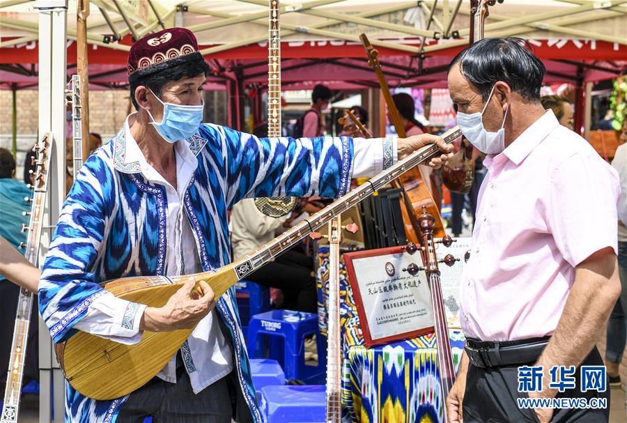 6月12日,在位于烏魯木齊大巴扎景區(qū)內(nèi)的活動現(xiàn)場,新疆維吾爾自治區(qū)非物質(zhì)文化遺產(chǎn)傳承人艾爾肯·吐么爾(左)在“維吾爾族樂器制作技藝”非遺項(xiàng)目展區(qū)演奏都塔爾。6月12日,“文旅融合,文物賦彩,非遺傳承,健康生活”2020年烏魯木齊市天山區(qū)文化和自然遺產(chǎn)日推介展演活動在大巴扎景區(qū)舉辦,吸引不少游客和市民觀賞。新華社記者王菲攝。