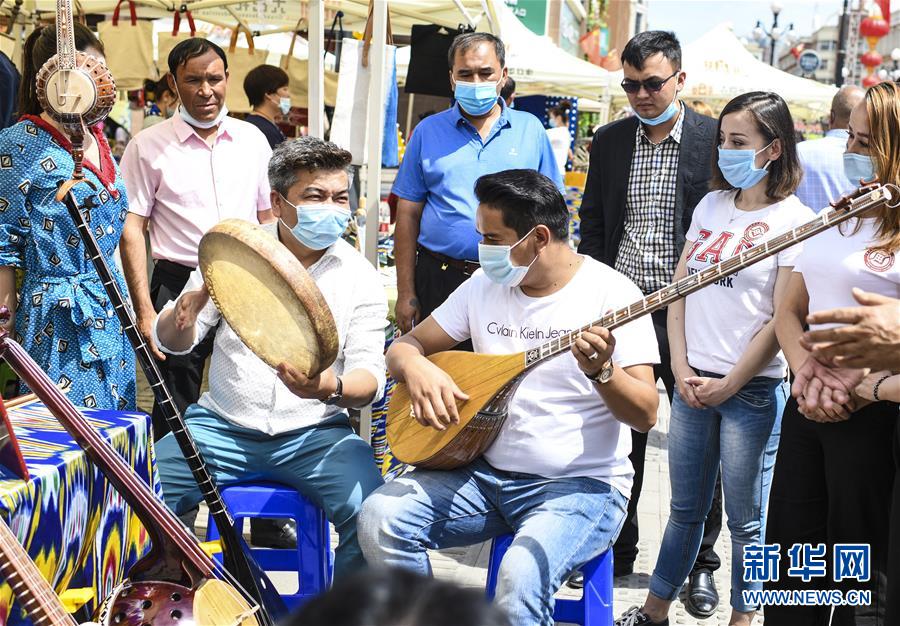 6月12日,在位于烏魯木齊大巴扎景區(qū)內(nèi)的活動現(xiàn)場,游客在“維吾爾族樂器制作技藝”非遺項(xiàng)目展區(qū)體驗(yàn)民族樂器彈奏。6月12日,“文旅融合,文物賦彩,非遺傳承,健康生活”2020年烏魯木齊市天山區(qū)文化和自然遺產(chǎn)日推介展演活動在大巴扎景區(qū)舉辦,吸引不少游客和市民觀賞。新華社記者王菲攝。