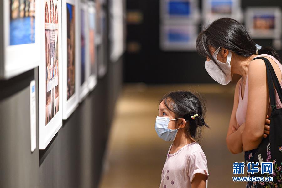 6月13日,觀眾在位于??诘暮D鲜〔┪镳^觀看“地球諧音——世界文化遺產(chǎn)攝影藝術(shù)展”。新華社記者蒲曉旭攝。