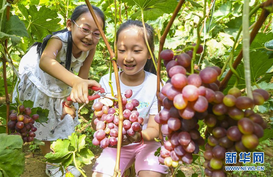 6月14日,小游客在河北省永清縣龍虎莊鄉(xiāng)劉莊村大棚內(nèi)采摘葡萄。