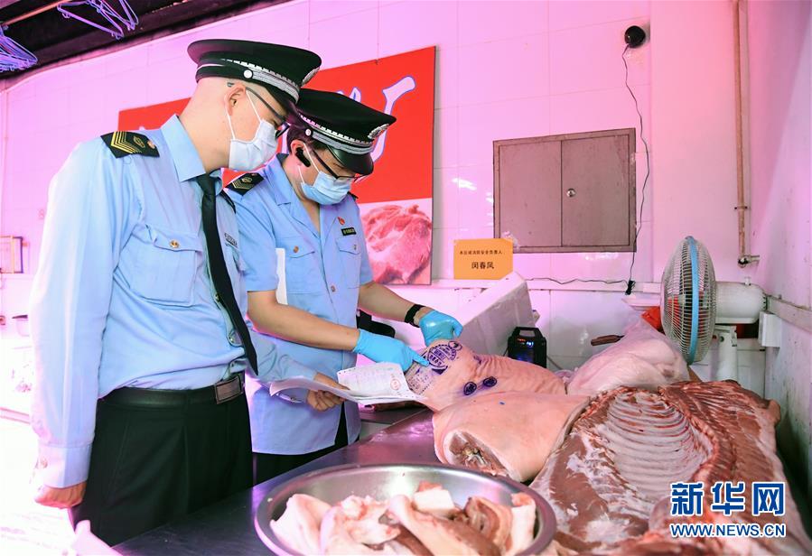 6月17日,在位于北京市海淀區(qū)的增光鴻運市場,執(zhí)法人員對商戶出售的鮮肉進行檢查。新華社記者 任超 攝