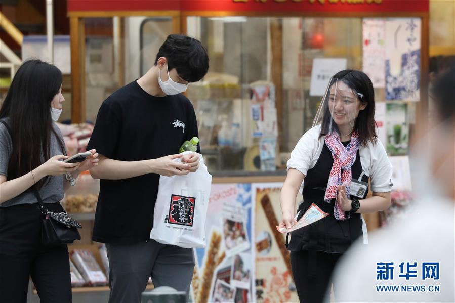 6月21日,在日本東京,一名人力車工作人員(右)向游客發(fā)傳單。當日是周末,日本政府繼解除全國各地緊急狀態(tài)之后,19日起解除避免跨縣移動的要求,全國范圍內(nèi)允許自由移動,進一步松綁社會經(jīng)濟活動。東京一些觀光景區(qū)內(nèi)的店鋪逐漸恢復營業(yè),人流量有所回升。新華社記者杜瀟逸攝