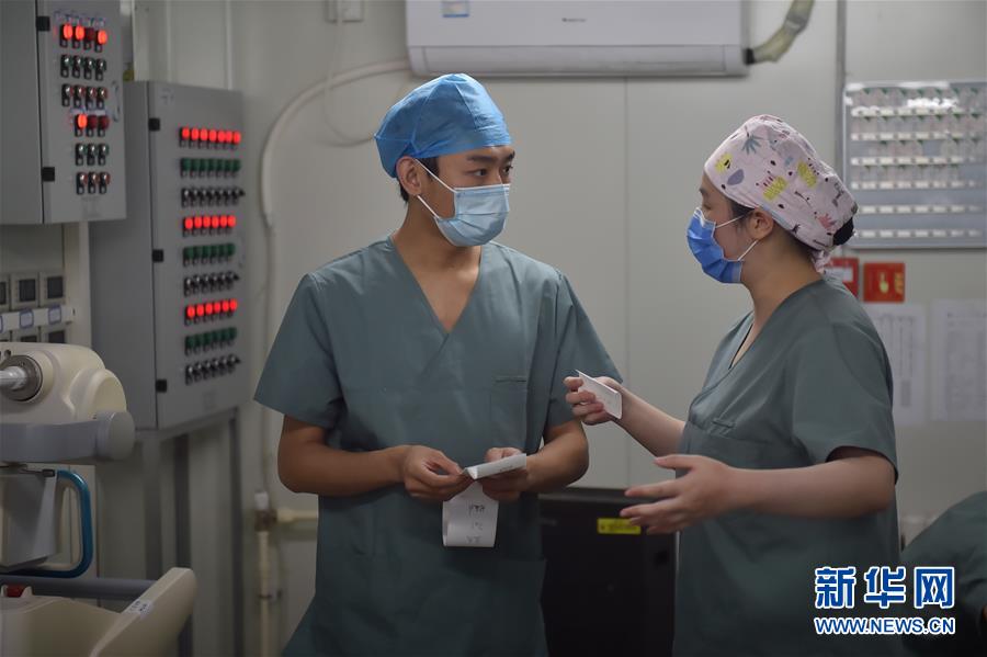 6月19日,在北京地壇醫(yī)院隔離病區(qū)護(hù)士站,白班護(hù)士(右)和夜班護(hù)士在做交接。新華社記者彭子洋攝