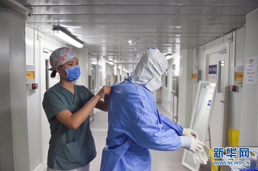 6月19日,在北京地壇醫(yī)院隔離病房外,一名護(hù)士在幫同事穿防護(hù)服。新華社記者彭子洋攝
