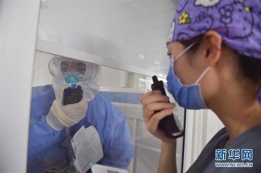 6月19日,在北京地壇醫(yī)院隔離病區(qū),一名來地壇醫(yī)院支援的護士(左)在跟地壇醫(yī)院的護士學(xué)習使用對講機。新華社記者彭子洋攝