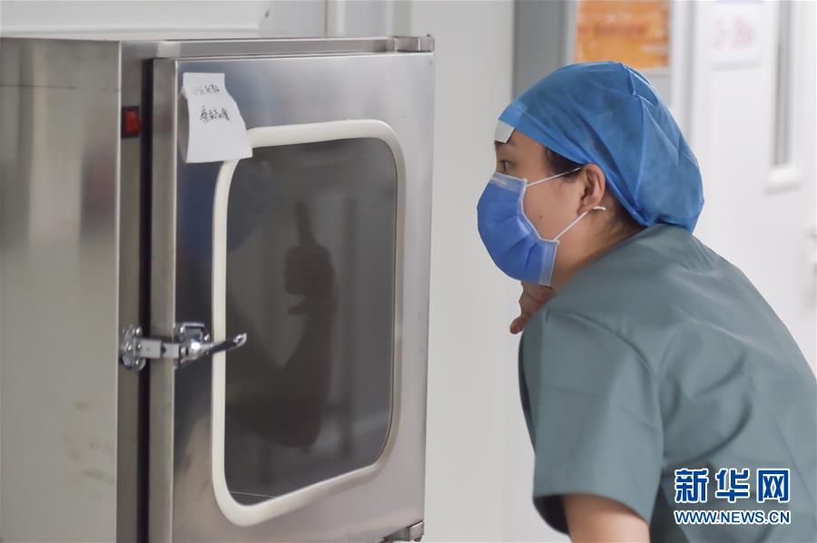 6月19日,在北京地壇醫(yī)院隔離病房外,護(hù)士和病人溝通,做著打電話的手勢(shì)。新華社記者彭子洋攝