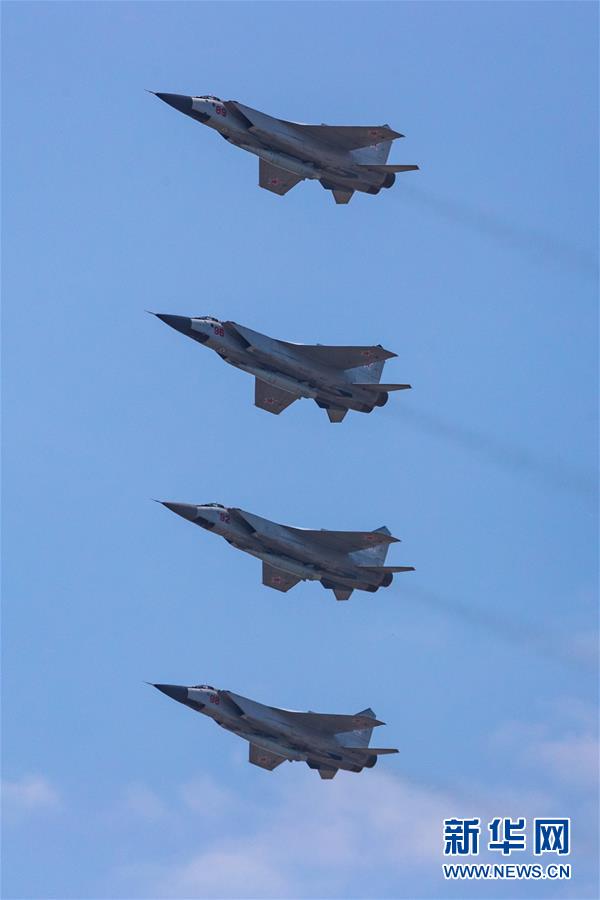 6月20日,在俄羅斯首都莫斯科,米格-31K戰(zhàn)斗機(jī)編隊(duì)參加閱兵式彩排。俄羅斯將于6月24日舉行紀(jì)念衛(wèi)國戰(zhàn)爭勝利75周年閱兵式。新華社記者白雪騏攝
