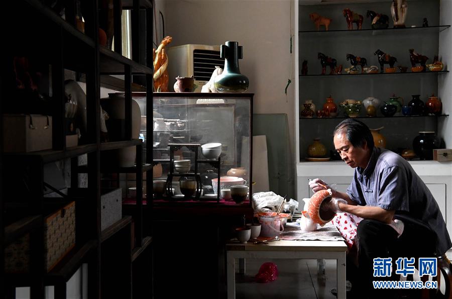 在河南省鞏義市站街鎮(zhèn)小黃冶村的工作室里,游光明運用點彩手法施釉(6月19日攝)。新華社記者李安攝
