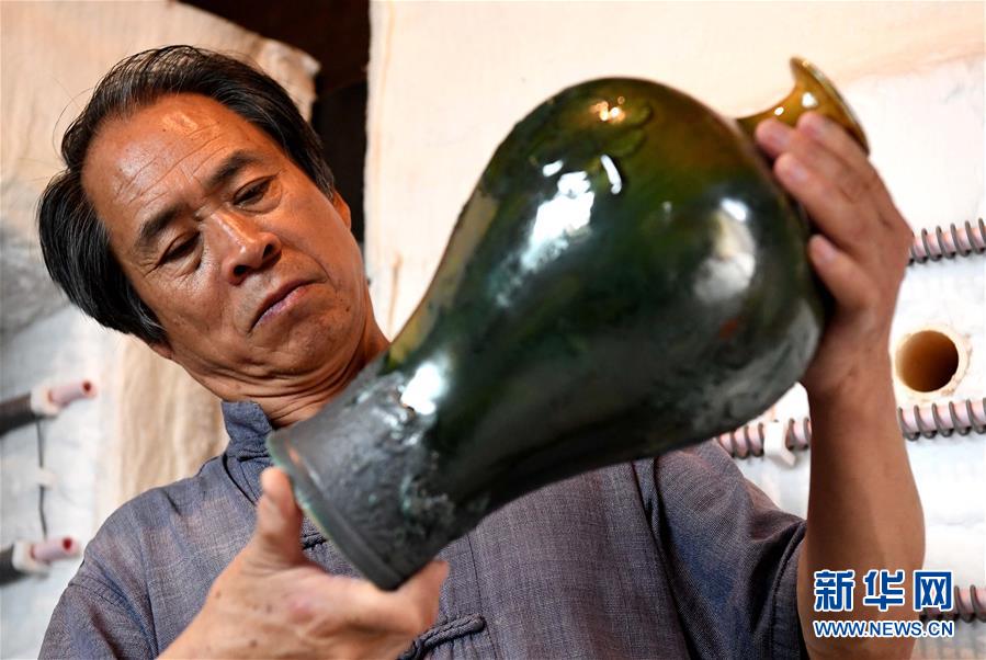 在河南省鞏義市站街鎮(zhèn)小黃冶村的工作室里,游光明在觀察燒制好的器物釉色(6月19日攝)。新華社記者李安攝