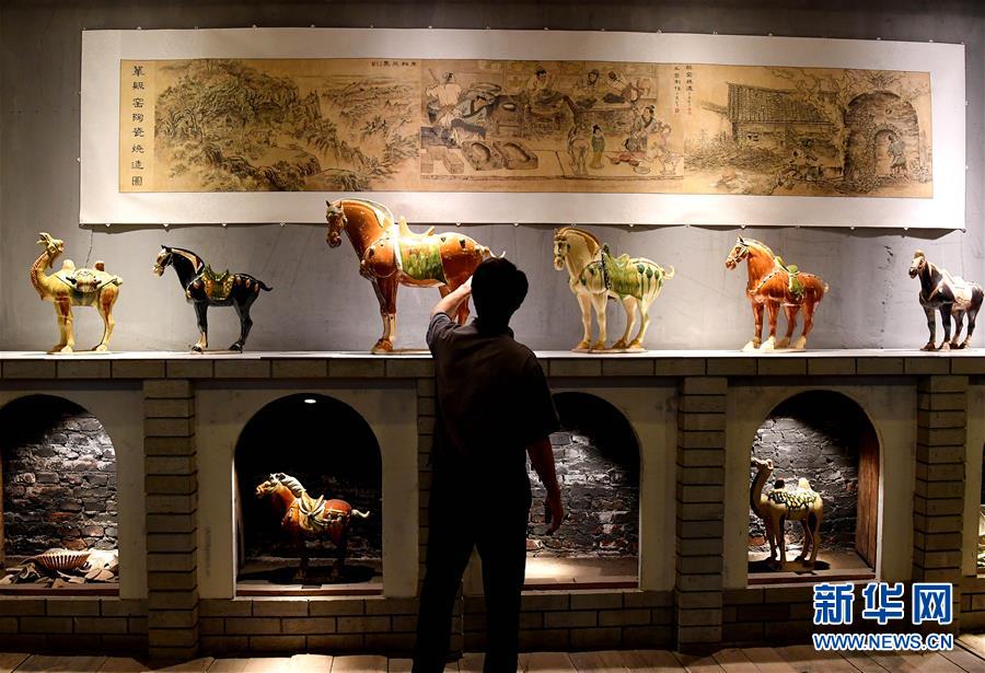 游光明在河南省鞏義市站街鎮(zhèn)小黃冶村的傳習(xí)所里查看作品(6月19日攝)。新華社記者李安攝