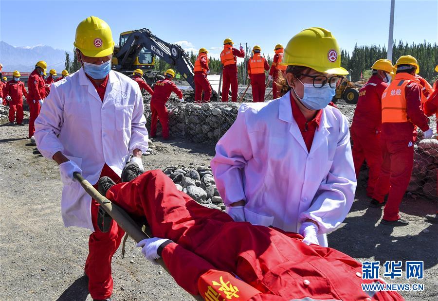6月22日,應急搶險隊員參加演練。當日,新疆維吾爾自治區(qū)公路管理局組織的2020年國省干線公路突發(fā)地質(zhì)災害應急演練在烏魯木齊舉行,演練模擬烏魯木齊市柴窩堡區(qū)域遭受強降雨,誘發(fā)附近水域突發(fā)洪水,公路路基面臨被洪水沖毀的險情,組織搶險人員和機械設備在指定時間內(nèi)趕赴受災現(xiàn)場實施應急搶險處置。此次演練將進一步增強各相關部門的防災減災意識,提高公路應急搶險處突能力。新華社記者王菲攝