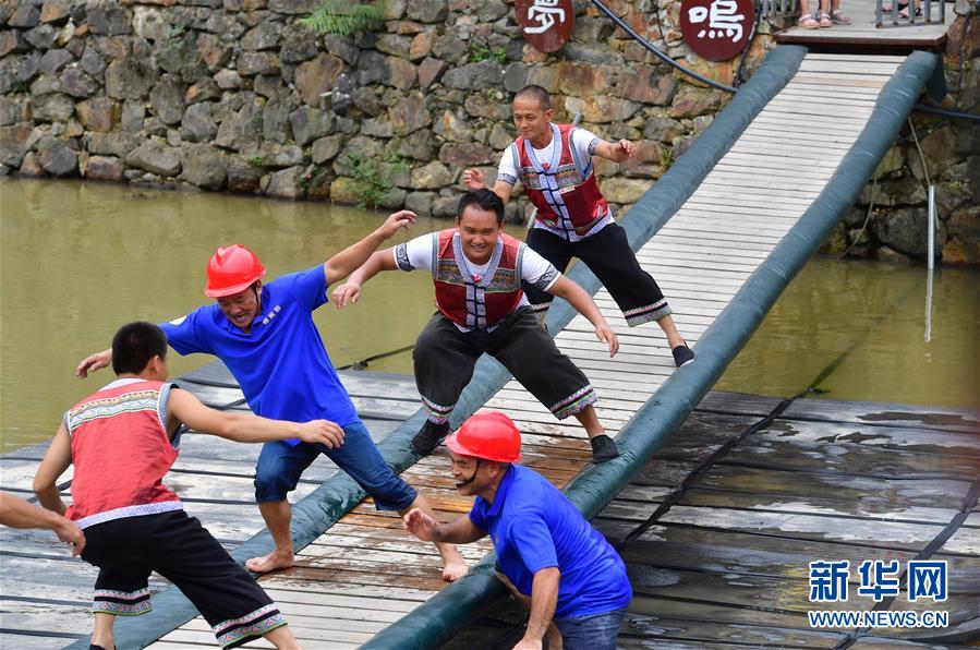 在廣西融水雙龍溝森林旅游度假區(qū)夢嗚苗寨,幾位搬遷戶協(xié)助游客挑戰(zhàn)“搖擺橋”(6月21日攝)。近年來,融水打造原生態(tài)苗族文化體驗(yàn)園——夢嗚苗寨,讓搬遷進(jìn)城的貧困戶住進(jìn)復(fù)原建設(shè)的老房子。景區(qū)提供綠化保潔、游樂設(shè)施管理、民族歌舞表演等工作崗位,多渠道增加貧困戶收入。