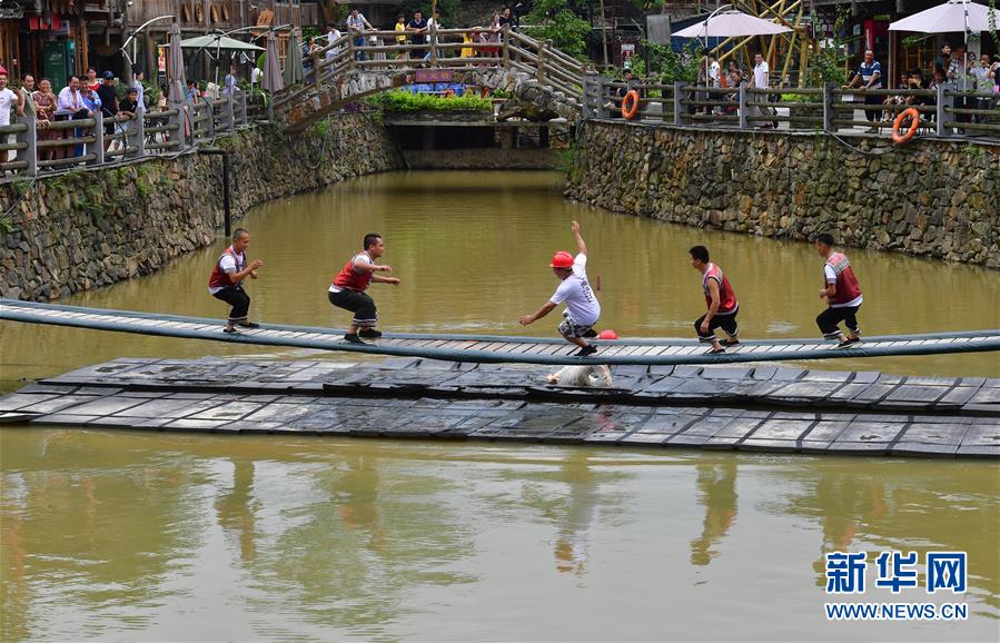 在廣西融水雙龍溝森林旅游度假區(qū)夢嗚苗寨,幾位搬遷戶協(xié)助游客挑戰(zhàn)“搖擺橋”(6月21日攝)。近年來,融水打造原生態(tài)苗族文化體驗(yàn)園——夢嗚苗寨,讓搬遷進(jìn)城的貧困戶住進(jìn)復(fù)原建設(shè)的老房子。景區(qū)提供綠化保潔、游樂設(shè)施管理、民族歌舞表演等工作崗位,多渠道增加貧困戶收入。新華社記者黃孝邦攝