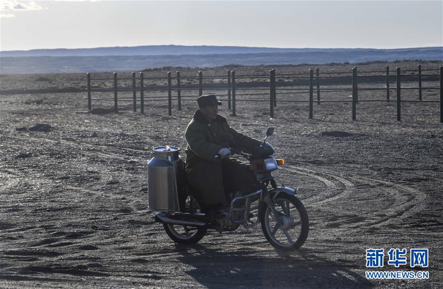 在吉木乃縣萬駝園內(nèi),傍晚時分,牧民米拉木別克·阿依提克準備騎著摩托車將駱駝趕回圈內(nèi)(6月21日攝)。