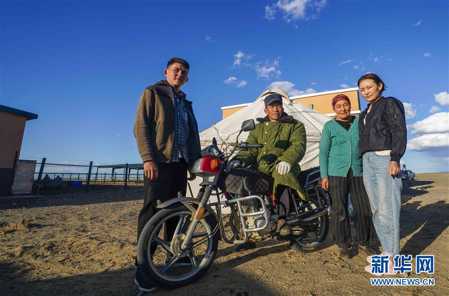 在吉木乃縣萬駝園內(nèi),牧民米拉木別克·阿依提克(左二)與家人在房前合影(6月21日攝)。新華社記者趙戈攝