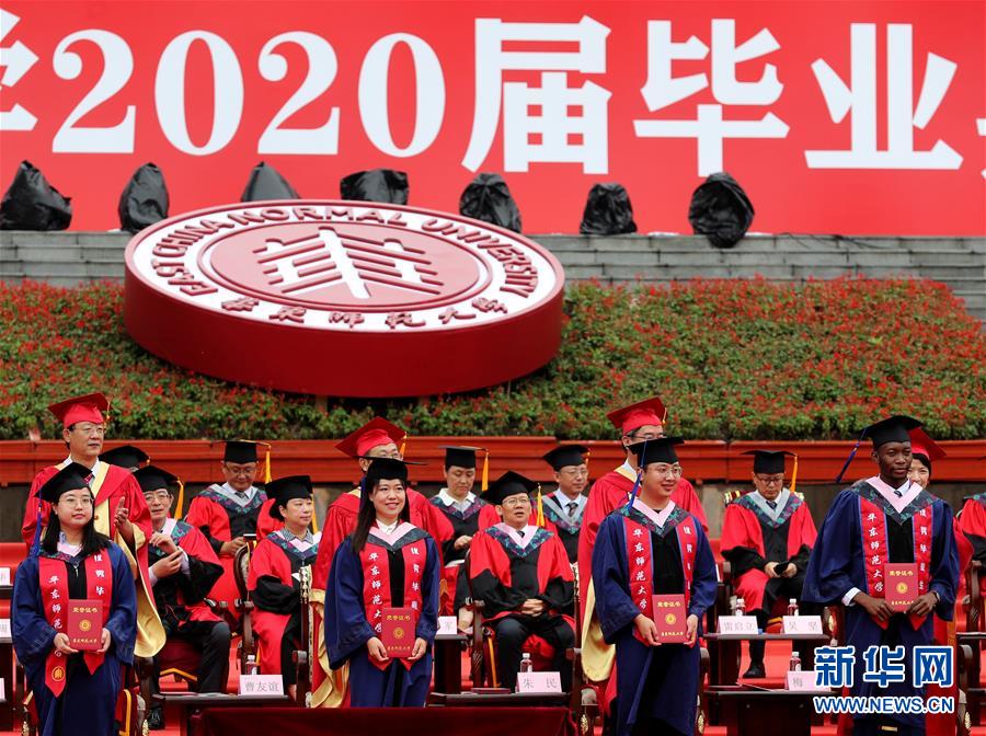 6月23日,在華東師范大學(xué)閔行校區(qū)的畢業(yè)典禮上,師范專業(yè)的畢業(yè)生舉行宣誓儀式。當(dāng)日,華東師范大學(xué)舉行2020屆畢業(yè)典禮。由于疫情防控需要,今年的典禮在兩個校區(qū)分別舉辦,并全程在線直播。約7700名華東師范大學(xué)2020屆畢業(yè)生通過現(xiàn)場或“云端”的方式參加畢業(yè)典禮。新華社記者劉穎攝