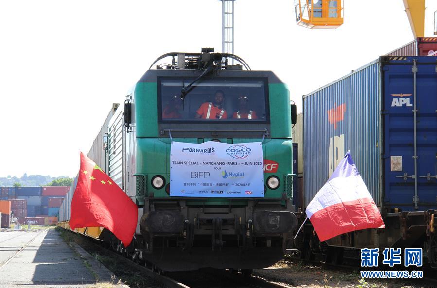 6月23日,滿載防疫物資的中歐班列抵達法國巴黎東南郊的瓦朗通。新華社記者徐永春攝