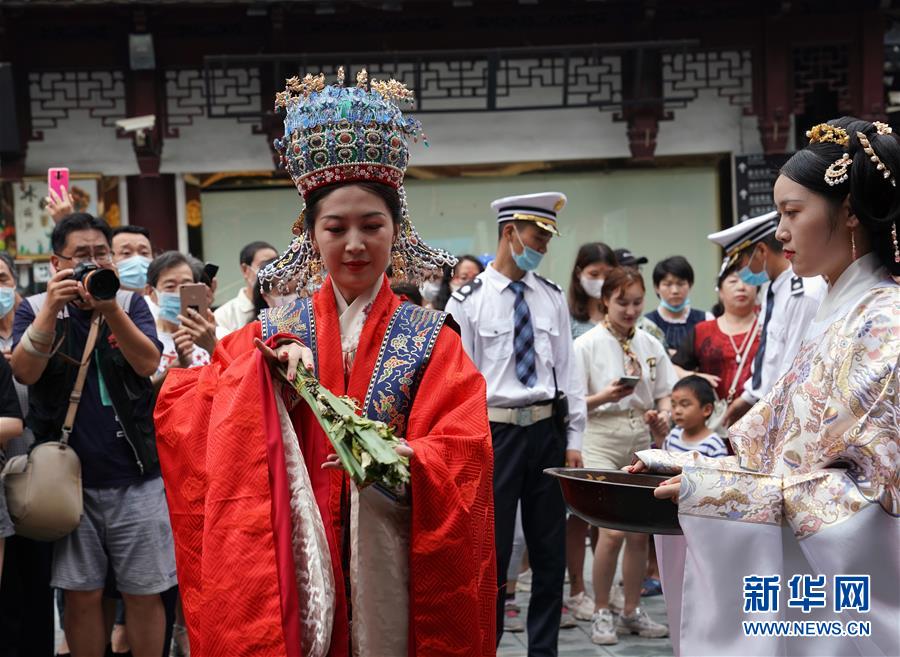 6月24日,在上海豫園舉辦的端午花神國風(fēng)廟會上,身著古裝的演員在表演。端午節(jié)臨近,各地舉行包粽子、做香包、賽龍舟等豐富多彩的民俗文化活動,迎接傳統(tǒng)佳節(jié)的到來。新華社記者劉穎攝