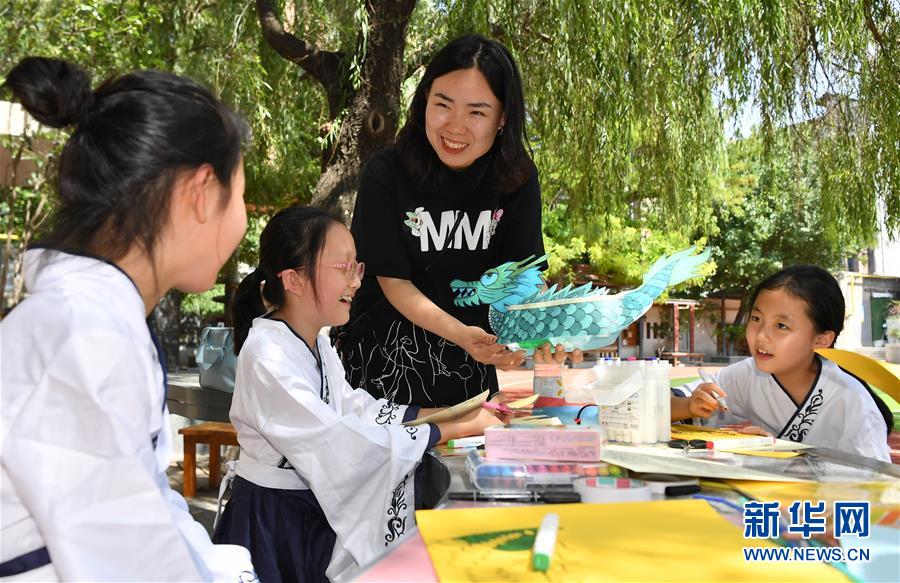 6月24日,西安市新城區(qū)后宰門小學(xué)的老師指導(dǎo)學(xué)生制作紙質(zhì)龍舟模型。端午節(jié)臨近,各地舉行包粽子、做香包、賽龍舟等豐富多彩的民俗文化活動(dòng),迎接傳統(tǒng)佳節(jié)的到來。新華社記者劉瀟攝