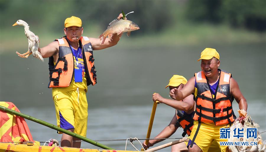 6月25日,參賽選手將放歸漢江中的鴨子抓到手中,鉆出水面,舉過頭頂,引來岸上一片歡呼。龍舟賽最引人注目的是搶鴨子、抓鯉魚。新華社記者 陶明 攝