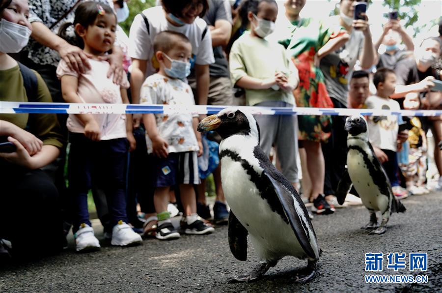 6月26日,上海動物園的企鵝在游客面前漫步。新華社記者 張建松 攝