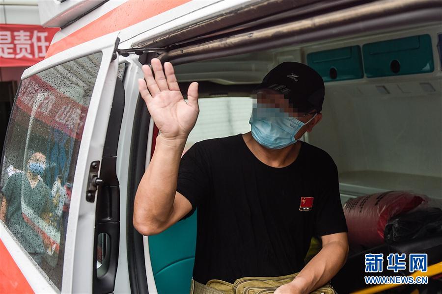 6月29日,在北京地壇醫(yī)院,患者何先生向送行的人們表示感謝。