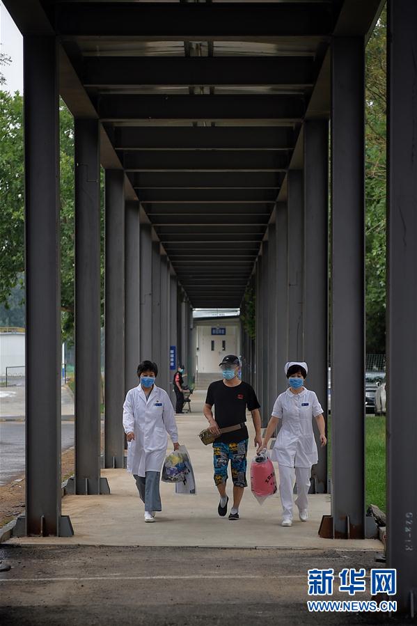 6月29日,在北京地壇醫(yī)院內(nèi),醫(yī)護(hù)人員送患者何先生離開(kāi)隔離病區(qū)。新華社記者彭子洋攝