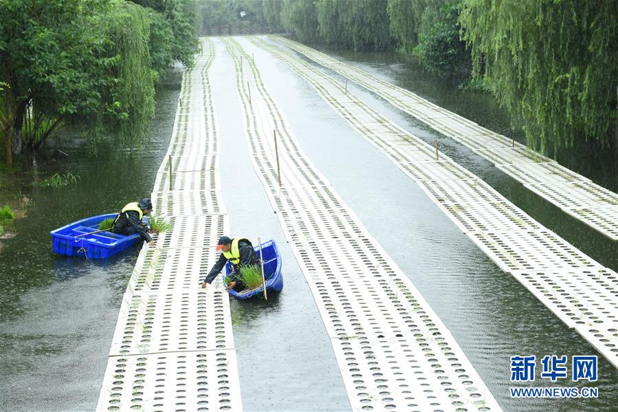 6月29日,工作人員在吳興區(qū)湖東街道的“水上稻田”插秧。今年以來,浙江湖州吳興區(qū)湖東街道開始在轄區(qū)河道大規(guī)模推廣“水上稻田”新型農(nóng)業(yè)項目,利用浮島進行特種水稻種植,既能凈化水體,又能產(chǎn)出生態(tài)稻谷。“水上稻田”預計在11月實現(xiàn)收割。新華社記者翁忻旸攝