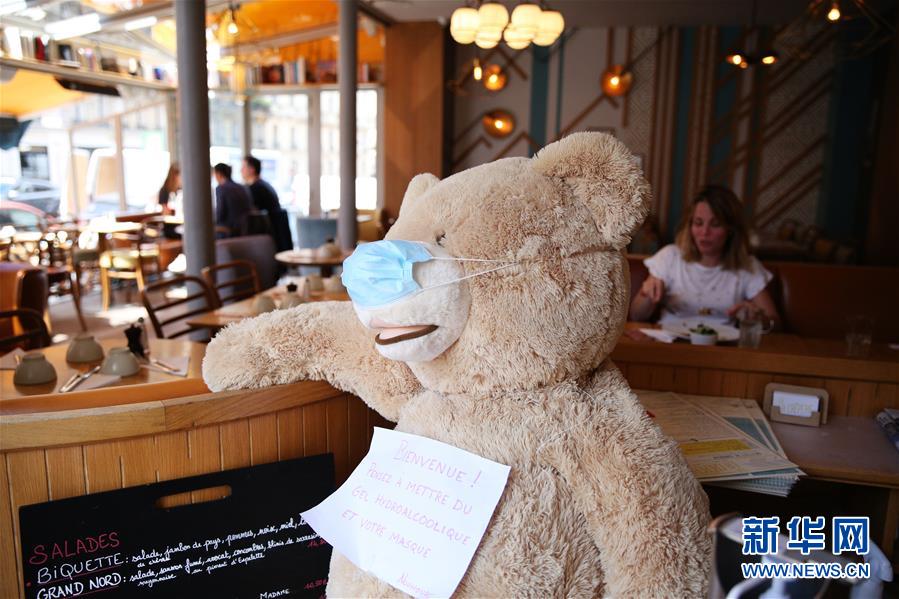 6月18日,在法國巴黎一家餐館內,一只毛絨玩具熊被戴上口罩,胸前掛著“歡迎光臨,請使用消毒洗手液并佩戴口罩”的牌子。新華社記者高靜攝