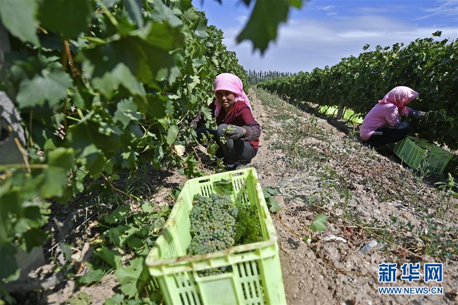 寧夏銀川市永寧縣閩寧鎮(zhèn)原隆村立蘭釀酒葡萄種植基地,農(nóng)戶在田間采摘葡萄(2019年9月3日攝)。新華社記者王鵬攝
