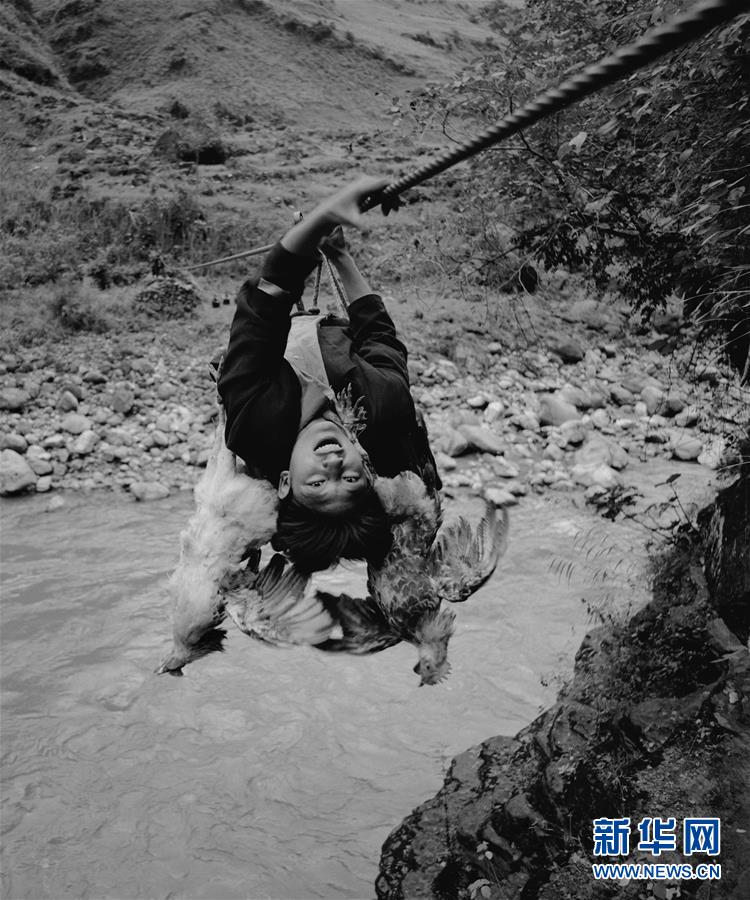 阿達色貴從阿布洛哈村用溜索過西溪河(2006年3月21日攝)。新華社發(fā)(林強攝)