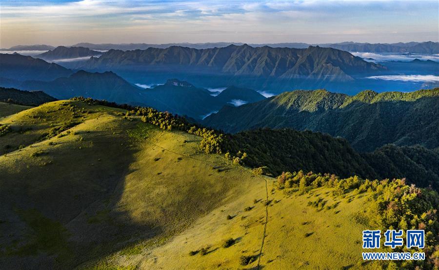 6月30日,晨曦中的神田草甸(無人機(jī)照片)。位于陜西省安康市嵐皋縣與重慶市城口縣交界處大巴山神田主脊北坡的神田草甸,面積超過1.1萬畝。夏日的朝霞中,起伏的草甸仿佛一塊寬大無邊的綠色地毯,鑲嵌在大巴山上,如詩如畫。新華社記者陶明攝