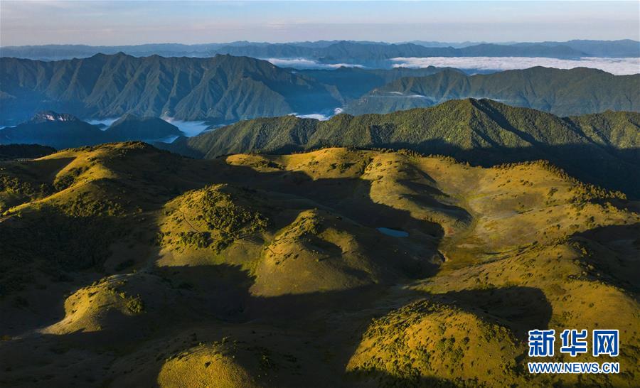 6月30日,朝霞照耀下的神田草甸(無人機(jī)照片)。位于陜西省安康市嵐皋縣與重慶市城口縣交界處大巴山神田主脊北坡的神田草甸,面積超過1.1萬畝。夏日的朝霞中,起伏的草甸仿佛一塊寬大無邊的綠色地毯,鑲嵌在大巴山上,如詩如畫。新華社記者陶明攝