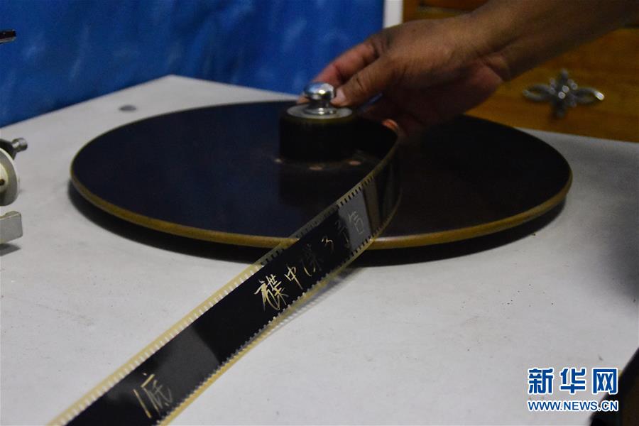 6月30日,朱生榮在當(dāng)晚電影開播前將膠片調(diào)至起始幀。新華社記者鄭夢雨攝
