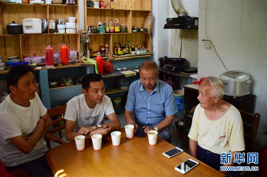6月30日,第二代放映人朱文炳(左一)、第四代放映人朱強(左二)與第三代放映人朱生榮(右二)來看望第一代放映人王志華(右一)。新華社記者鄭夢雨攝