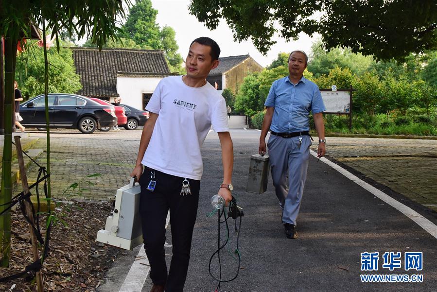 6月30日,朱生榮(右)和兒子朱強(左)在馬鳴村將軍湖廣場布置放映設(shè)備。