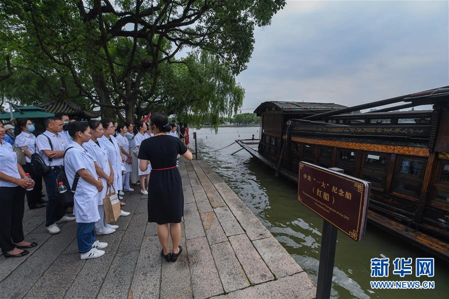 7月1日,嘉興市新冠肺炎疫情抗疫一線黨員在南湖景區(qū)的中共一大紀念船邊參加“七一”活動。新華社記者徐昱攝