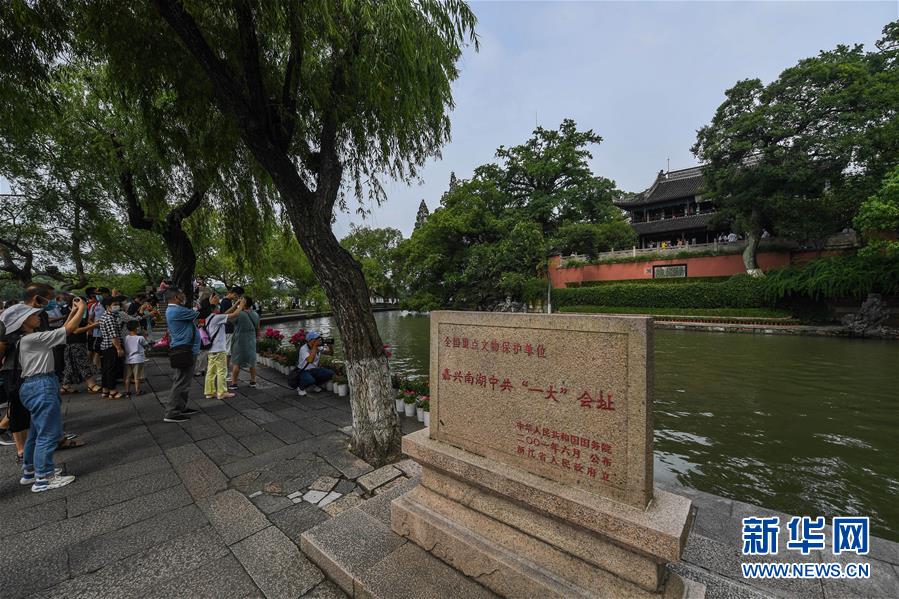7月1日,游客游覽嘉興南湖景區(qū)的中共一大會址。新華社記者徐昱攝