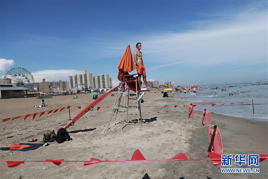 7月1日,救生員在美國紐約科尼島的一處海灘查看海面情況。當日,美國紐約市屬八處海灘正式重新準許民眾游泳,救生員也同時上崗。新華社記者王迎攝