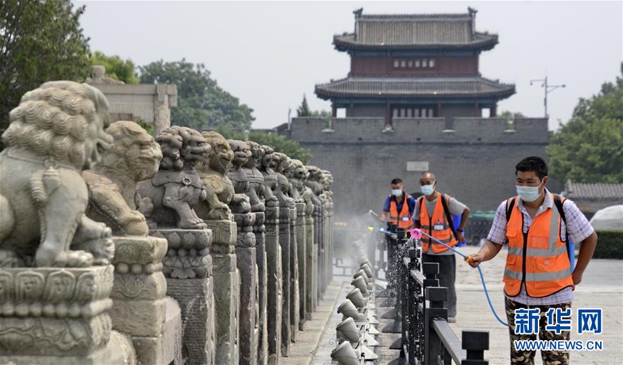 7月4日,防疫人員在盧溝橋景區(qū)進(jìn)行環(huán)境消毒。當(dāng)日,北京市豐臺(tái)區(qū)組織防疫人員、安全監(jiān)察部門(mén)人員對(duì)社區(qū)、超市、公共場(chǎng)所進(jìn)行大規(guī)模環(huán)境消毒及疫情隱患排查,全力保障市民生活和工作環(huán)境安全。新華社記者 李欣 攝