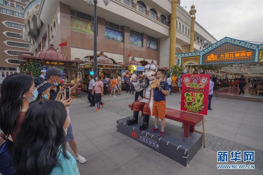 游客在烏魯木齊大巴扎美食街前拍照留念(7月4日攝)。夏日周末,烏魯木齊市大巴扎景區(qū)內(nèi)熙熙攘攘,人們來到這里品嘗美食、休閑購(gòu)物。2018年,經(jīng)過靚化改造后的大巴扎景區(qū)新增長(zhǎng)約800米的步行街,分為文創(chuàng)文旅和“非遺”項(xiàng)目街區(qū)、國(guó)際時(shí)尚街區(qū)和大巴扎美食街區(qū),是烏魯木齊最受歡迎的旅游目的地之一。新華社記者趙戈攝