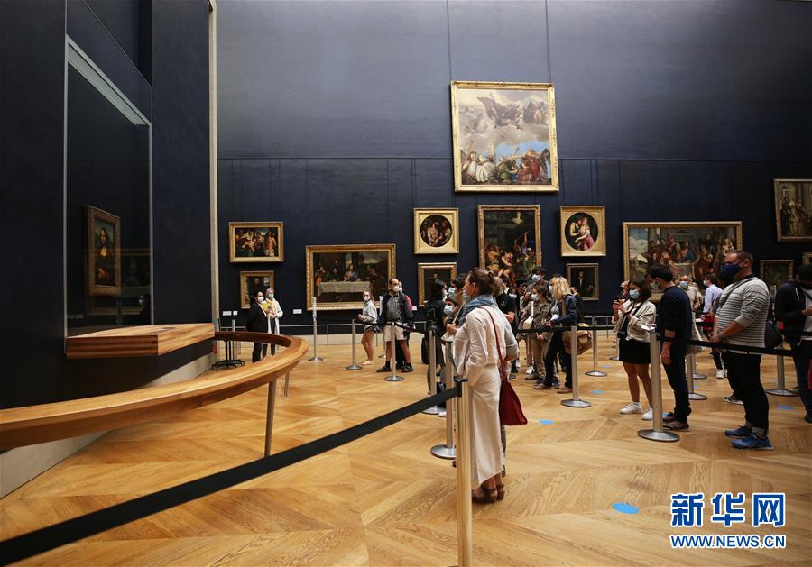 7月6日,參觀者在法國巴黎盧浮宮博物館欣賞萊昂納多·達(dá)·芬奇的名作《蒙娜麗莎》。因新冠病毒疫情關(guān)閉3個(gè)多月后,法國盧浮宮博物館于6日重新開放。新華社記者高靜攝