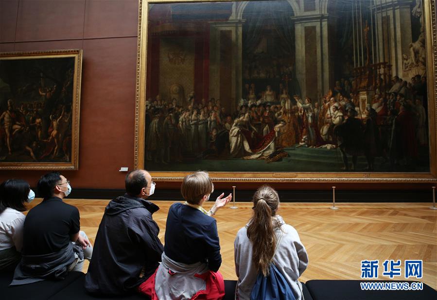 7月6日,參觀者在法國巴黎盧浮宮博物館欣賞畫作《拿破侖加冕》。因新冠病毒疫情關閉3個多月后,法國盧浮宮博物館于6日重新開放。新華社記者高靜攝