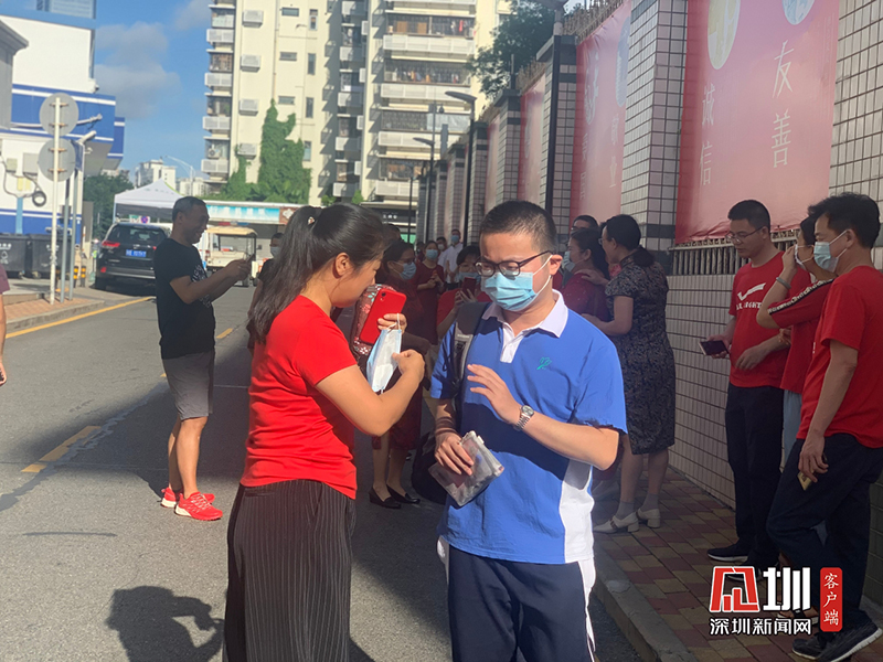 考生學(xué)長來到深圳紅嶺中學(xué)考點(diǎn)門口為學(xué)弟舉起“奧利給”的旗子。
