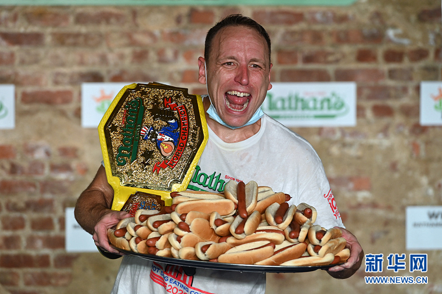 7月4日,美國(guó)紐約布魯克林舉行一年一度的國(guó)際吃熱狗比賽,喬伊·切斯納特以吃75個(gè)熱狗的成績(jī)贏得男子賽區(qū)冠軍,創(chuàng)下了新的世界紀(jì)錄。(圖片來(lái)源:視覺(jué)中國(guó))