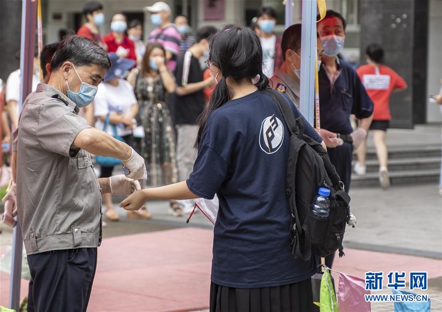 7月7日,江西省南昌市豫章中學考點工作人員為考生測量體溫。當日,2020年高考拉開帷幕。新華社記者張浩波攝