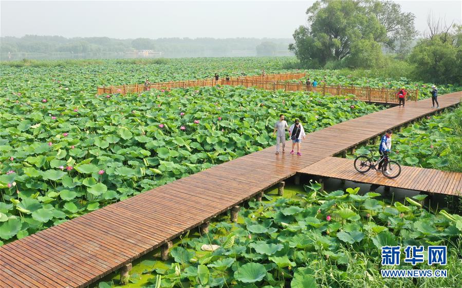 7月7日,游客在唐山市南湖公園欣賞盛開的荷花(無(wú)人機(jī)照片)。近日,河北省唐山市南湖公園內(nèi)荷花競(jìng)相綻放,呈現(xiàn)出“接天蓮葉無(wú)窮碧,映日荷花別樣紅”的美麗景象,吸引了眾多游客前來(lái)觀賞。新華社記者楊世堯攝