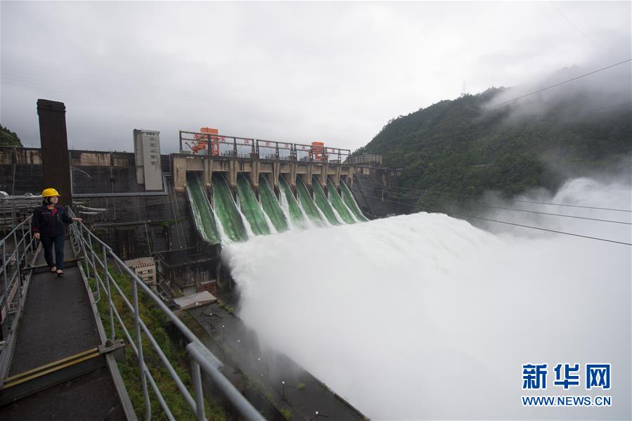 7月8日,新安江水庫開啟9孔泄洪,工作人員在新安江電廠開關(guān)站上進行設(shè)備巡查。新華社記者翁忻旸攝