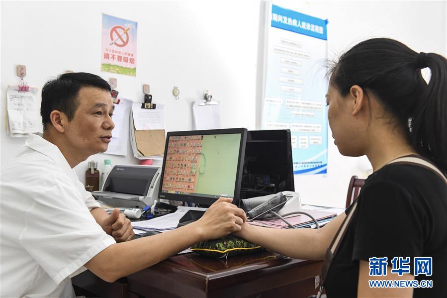 7月8日,在長(zhǎng)垌鄉(xiāng)衛(wèi)生院,陶雷(左)給一名病人把脈。