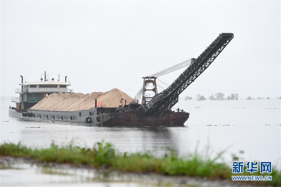 在益陽(yáng)市大通湖區(qū)東大堤附近水域,一艘船采取“以船代倉(cāng)”方式儲(chǔ)備防汛物資(7月8日攝)。新華社記者陳澤國(guó)攝